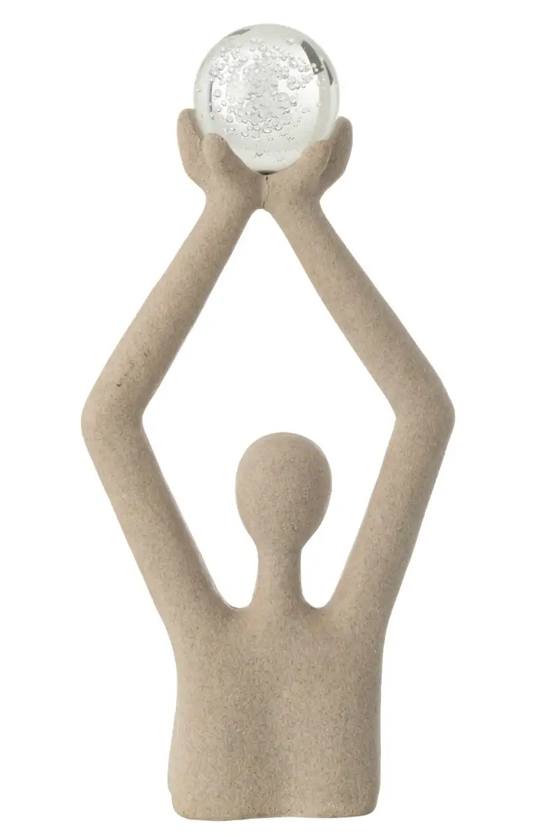Dit indrukwekkende beeld van een persoon die een bal boven het hoofd houdt straalt kracht, balans en elegantie uit. De combinatie van beige polyresin en een transparante kristalglazen bal geeft het kunstwerk een moderne en verfijnde uitstraling. De bustevorm en verticale compositie maken dit beeld tot een echte blikvanger in elk interieur.