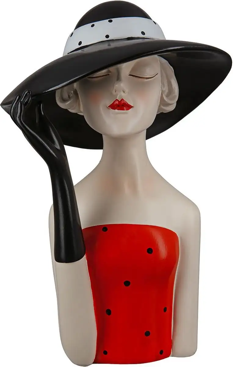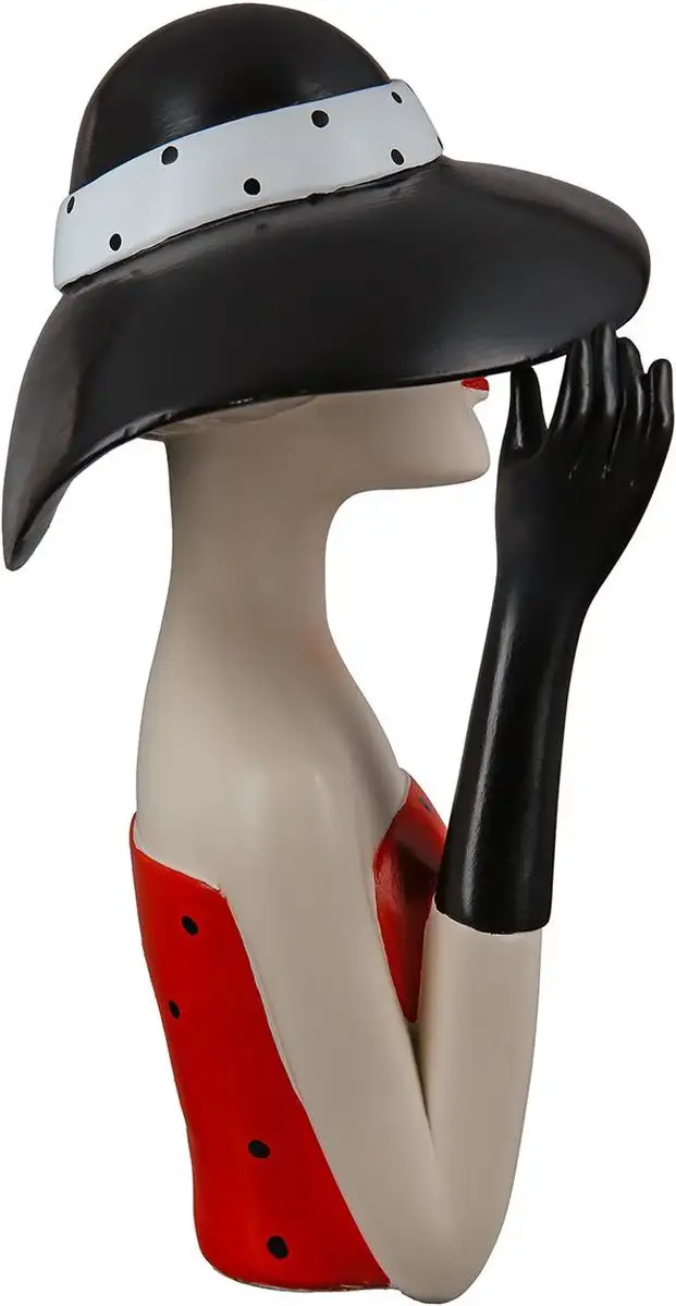 Voeg stijl en elegantie toe aan je interieur met dit verfijnde beeld van een vrouw met hoed. Uitgevoerd in een krachtige combinatie van rood en zwart, straalt dit beeld klasse en mysterie uit. Gemaakt van duurzaam polyresin en met een formaat van 19x29x15 cm, is dit decoratieve kunstobject een echte eyecatcher op een dressoir, plank of bijzettafel.