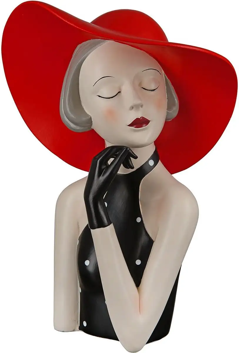 Voeg een stijlvol en artistiek accent toe aan je interieur met dit elegante beeld van een vrouw met rode hoed. De combinatie van diep rood en zwart geeft het beeld een krachtige en mysterieuze uitstraling. Gemaakt van hoogwaardig polyresin en met een afmeting van 20x27x14 cm, is dit decoratieve object perfect voor op een dressoir, bijzettafel of in een vitrinekast.