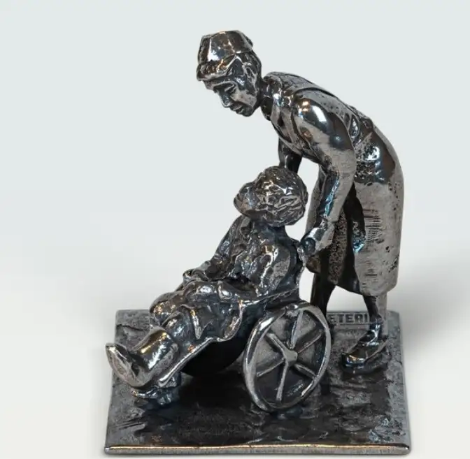 Tinnen sculptuur van het ambacht “Beroepen beeldje tin - Verpleegster met rolstoel tin beeldje" in een prachtige opstelling.