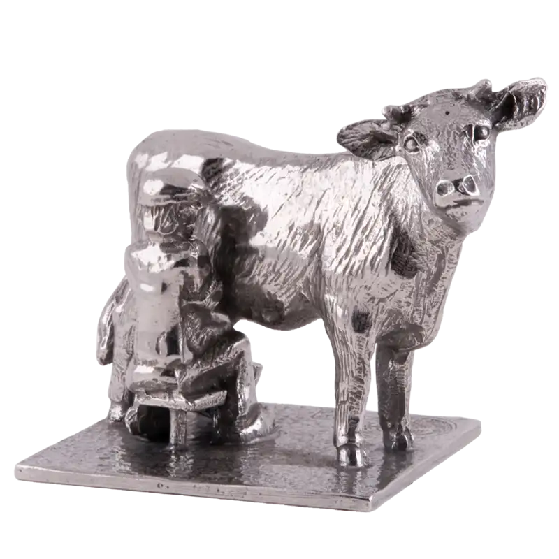 Tinnen sculptuur van het ambacht “Boer beeldje tin - Boer melkend met koe beeldje”, in prachtige opstelling