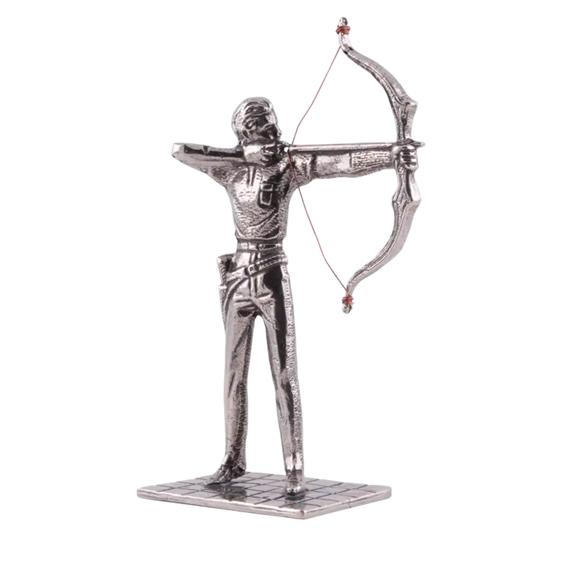 Tinnen sculptuur van het ambacht “boogschutter”, in prachtige opstelling inclusief buigtang en materiaal.