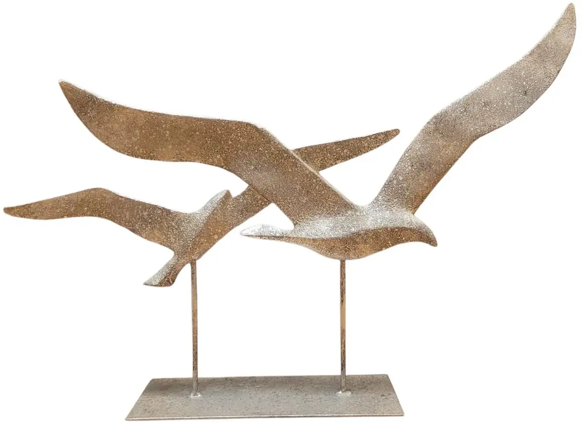 Breng een vleugje kustsfeer in huis met dit elegante vogelobject van zilverkleurige meeuwen. Het staande decoratiestuk is vervaardigd uit een combinatie van metaal en polyresin, wat zorgt voor een verfijnde uitstraling én duurzaamheid. De sierlijke meeuwen lijken in beweging, wat het beeld een dynamisch en luchtig karakter geeft.